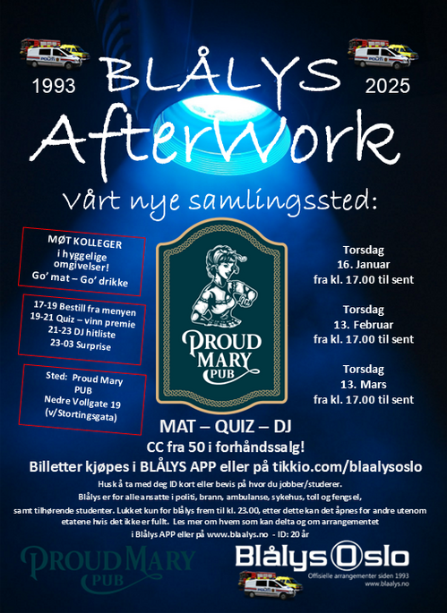 Dørene vil åpne for AFTERWORK fra kl 17.00 og det vil være lukket for blålys ansatte frem til kl. 23.00 (eller lenger hvis det er fullt). Det vil skje noe ca. kl. 19.00 i form av quiz, musikk bingo eller annet sosialt, så møt opp. Mat kan kjøpes til rabatterte priser og vi beholder våre faste blålys priser på drikke. Fra kl. 17.00-23.00 er det DJ, og etter 23.00 vil det bli surprise underholdning :)