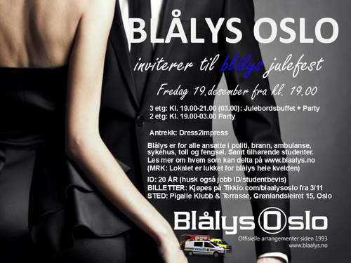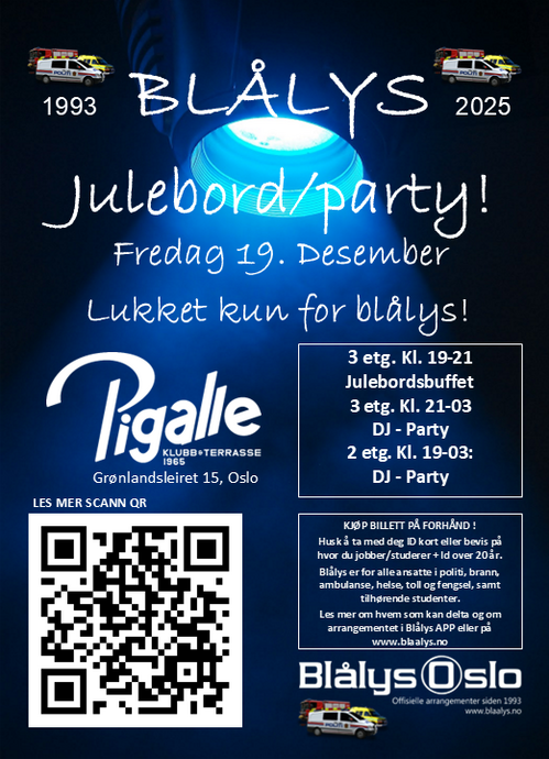 Ta med divisjonen, seksjonen eller dine nærmeste kolleger og feir julen inn med litt digg mat og god drikke. Vi lover god stemning og kanskje kommer julenissen I år kjører vi BLÅLYS JULEBORD på legendariske Pigalle Klubb & Terrasse i Grønlandsleiret 15. Vi har plass til 110 personer til mat og vi vil prioritere å fylle opp disse først. Ta med deg kolleger og delta på årets julebords fest. Dørene åpner kl. 19.00 for julebordsbuffet og det er "free sitting" i 3 etg. DJ spiller musikk hele kvelden. I billetten er det inkludert inngang og julebordsbuffet. Drikke kjøpes av servitør og/eller i baren.