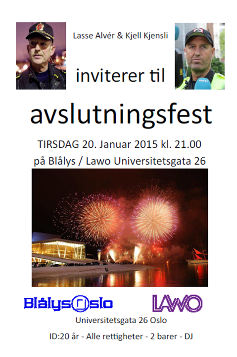 Tirsdag 20. Januar inviterer vi til BLÅLYSfest og feirer at Lasse Alver (OPD) og Kjell Kjensli (OBRE) skal slutte i sine respektive etater. De vil derfor at så mange som mulige legger turen innom for å skravle litt om "gamle dager".