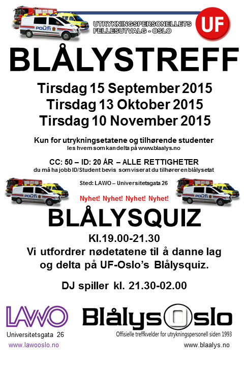 Fra 15 September arrangerer vi BLÅLYS QUIZ i samarbeid med UF-Oslo (Utrykningspersonellets Fellesutvalg). Dette vil være fra kl 19.00-21.30. Vi oppfordrer nødetatene til å danne lag på forhånd og møte opp. Vi håper å se mange kjente fjes på vår første BLÅLYS QUIZ..