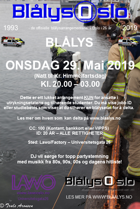 BLÅLYS OSLO arrangerer blålystreff i Oslo. Ett sted hvor kolleger på tvers av etatene kan møtes. Ansatte i Brann, Ambulanse, Politi, Tollvesen, Fengsel, Leger og Sykepleiere, samt studenter fra tilhørende etater har adgang. Møt hyggelige kolleger til sosialt samvær. Vi har bar med blålys priser og DJ som spiller variert hitliste musikk.