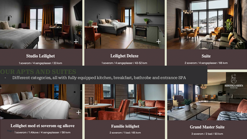 - Leilighet - kr 1.095 pr pers. pr. døgn, inkludert frokost, badekåpe og inngang SPA. Man kan bo 2, 4 eller 6 personer i leilighet.